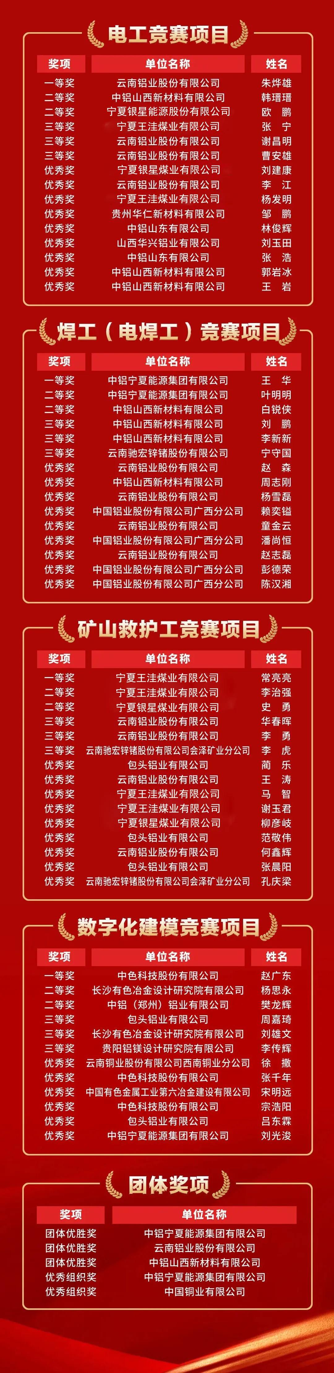 经过激烈角逐,云铝股份朱烨雄、宁夏能源王华荣、王洼煤业常亮亮、中色科技赵广东分别荣获电工、获焊工(电焊工)、矿山救护工、数字化建模竞赛项目一等奖。宁夏能源、云铝股份、山西新材料荣获团体优胜奖,中国铜业、宁夏能源荣获团体优秀奖。