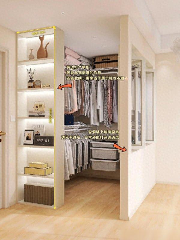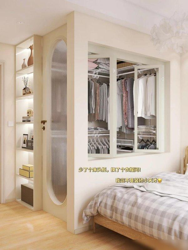 要是嫌洞洞板太“露”,或者房间面积够大,第二套方案更“精致”:把床头柜的位置让出来,做个带展示柜的衣帽间!用轻龙骨加石膏板砌一面侧墙,中间挖空装扇窗户——既能通风(避免衣帽间闷出异味),又能借窗外的光放大空间,比堵死墙的“闷罐子”舒服多了。