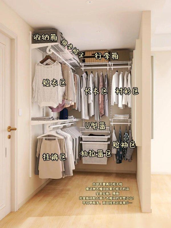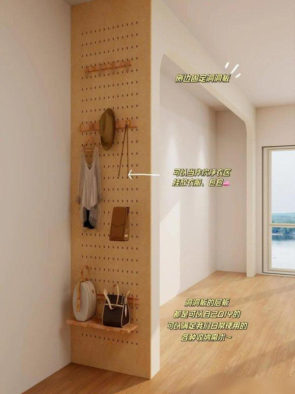 先说说第一套火到网友吵架的“全挂式”:直接在靠窗位置定制洞洞板当侧墙,不用一块板材,墙上装壁挂金属衣架——平时穿的大衣、搭配好的包包直接挂上面,睡前把第二天要穿的“整套组合”挂好,早上出门拎起就走,再也不用翻遍衣柜找袜子、揉皱刚熨好的衬衫。