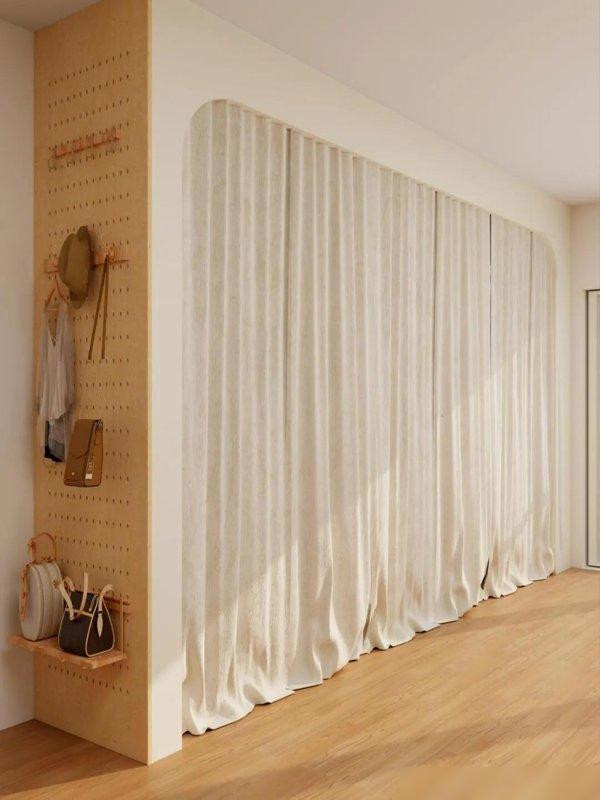 让师傅做个法式拱形门框,挂个浅色系防尘拉帘,4米多长的金属衣柜搞定,性价比直接拉满!