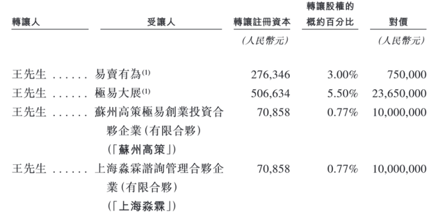 具体来看,2020年6月,王珊以350万元的价格向元禾原点转让0.43%股权;2020年12月至2021年7月期间,又以75万元、2365万元分别向极易科技员工激励平台易卖有为、极易大展合计转让8.5%股权,以1000万元的价格分别向苏州高策、上海淼霖转让0.77%、0.77%股权。